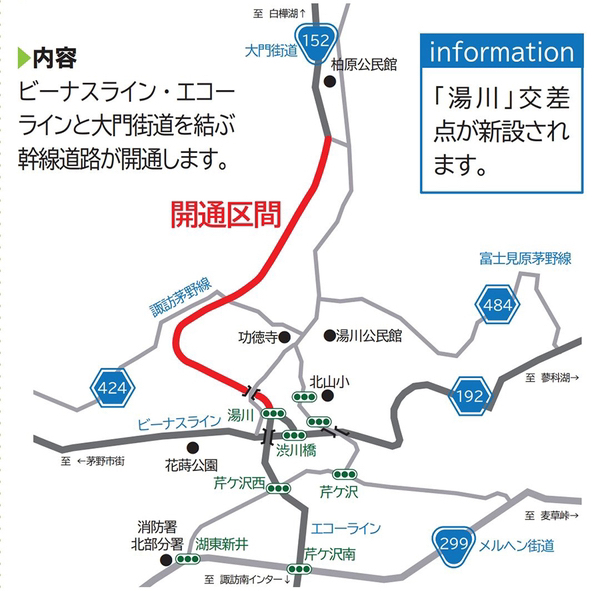 - 【諏訪南インター】からお越しの方は、八ヶ岳エコーラインから白樺湖方面へ。芹ヶ沢西交差点を直進していただくと152号線「湯川バイパス」へ直結していますので、上田・白樺湖方面へお進みください。