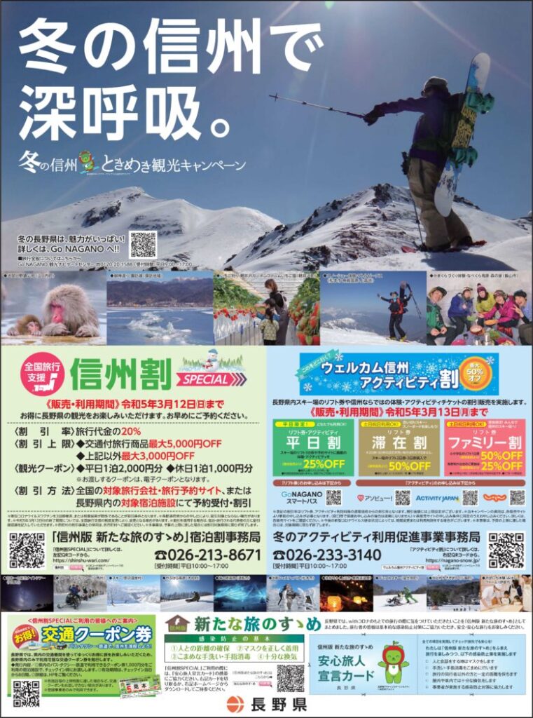 2023年1月10日〜3月30日 信州割special(全国旅行支援)、全コースにご使用いただけます。
